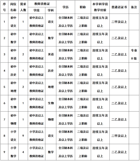 3.語(yǔ)文教師普通話二級(jí)甲等及以上,其他學(xué)科教師普通話二級(jí)乙等及以上,英語(yǔ)教師達(dá)到專業(yè)八級(jí)。