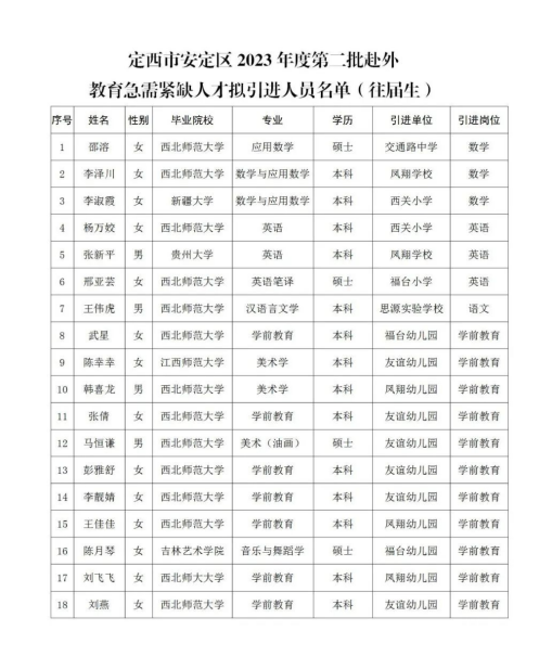附件:定西市安定區(qū)2023年度第二批赴外教育急需緊缺人才擬引進人員名單(往屆生)