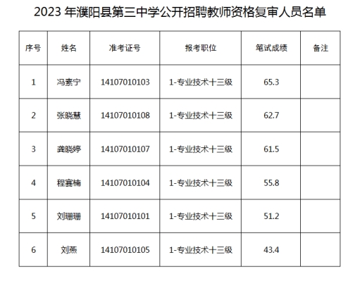 1.2023年濮陽縣第三中學(xué)公開招聘教師資格復(fù)審人員名單