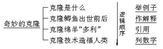 明確:1.文章先寫克隆的含義,接著寫克隆實驗,再寫克隆的發(fā)展,最后寫克隆對人類的造福和對克隆的理性思考。全文采用了邏輯順序說明事理,逐層深入,步步推進。