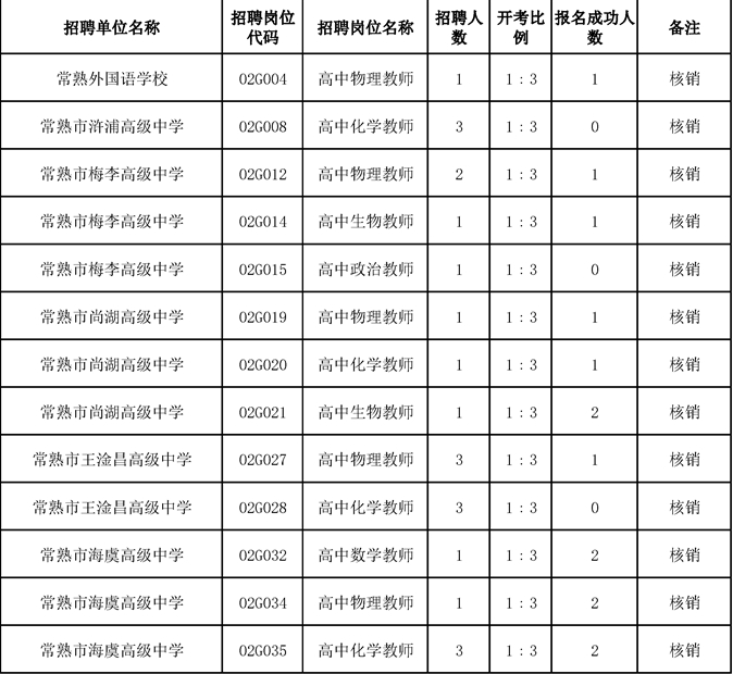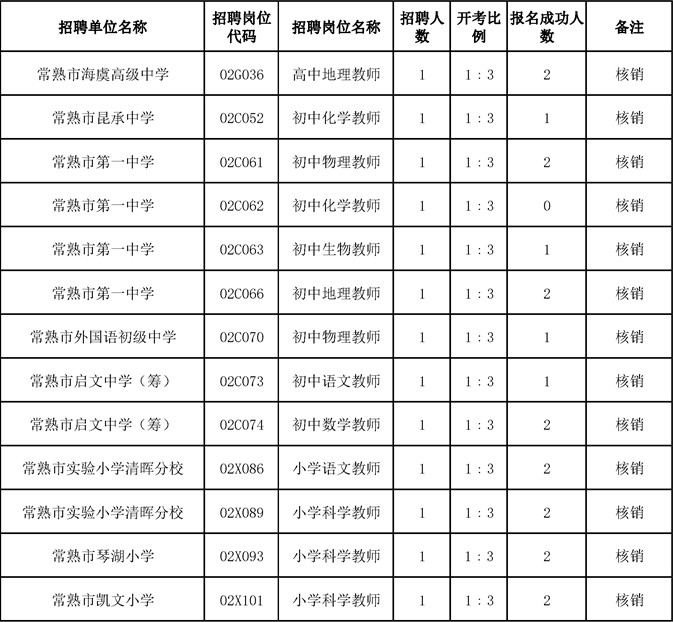 根據(jù)《常熟市2024年教育系統(tǒng)公開選聘優(yōu)秀畢業(yè)生公告(第二批)》規(guī)定:“繳費結(jié)束后,報名成功人數(shù)達不到開考比例的核減招考計劃,直至取消該崗位招聘。應(yīng)聘崗位被取消的報名成功人員,可改報其他符合條件的崗位,具體時間另行通知”。請符合改報條件的考生,于2023年12月26日14時前完成改報,具體方法請登錄常熟市教育系統(tǒng)教師招聘網(wǎng)上信息采集系統(tǒng)入口2通知公告欄相關(guān)公告,逾期未改報視作放棄報名資格。具體核銷崗位如下: