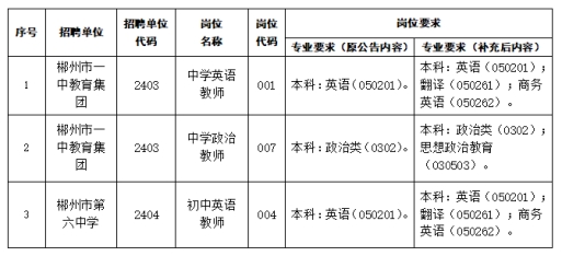 3.原公告附件1中郴州市第六中學(招聘單位代碼2404)“初中英語教師”崗位(代碼004)的“專業(yè)要求”增加“翻譯(專業(yè)代碼:050261)”及“商務(wù)英語(專業(yè)代碼:050262)”。