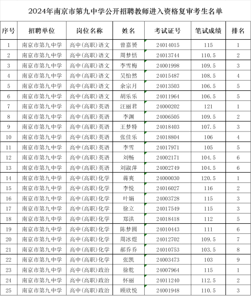 《2024年南京市第九中學公開招聘教師進入資格復審考生名單》(附后)