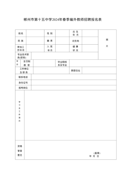 郴州市第一中學(xué)南校區(qū)(郴州市第十五中學(xué))2024年春季編外教師招聘報名表