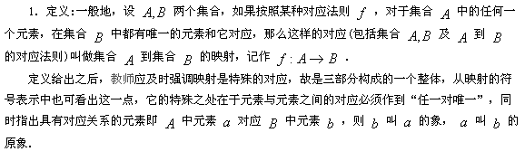 ①映射的概念是比較抽象的概念,它是在初中所學(xué)對應(yīng)的基礎(chǔ)上發(fā)展而來.教學(xué)中應(yīng)特別強調(diào)對應(yīng)集合 B中的唯一這點要求的理解;