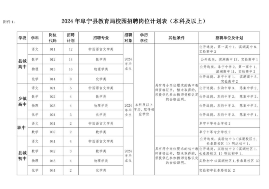 1.2024年春阜寧縣教育局校園招聘崗位計劃表(本科及以上)