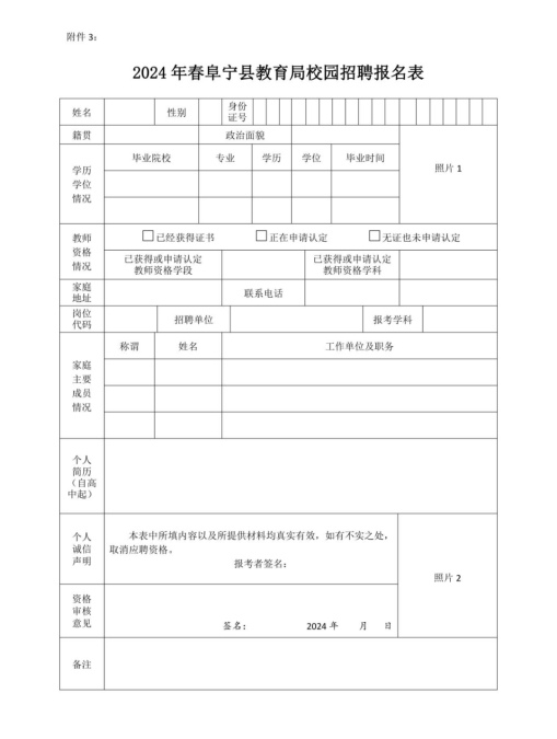 3.2024年春阜寧縣教育局校園招聘報名表