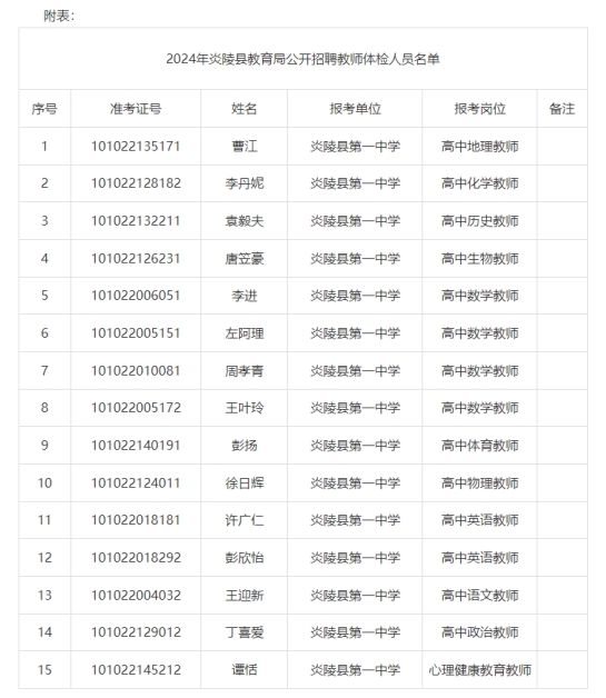 附表:2024年炎陵縣教育局公開招聘教師體檢人員名單