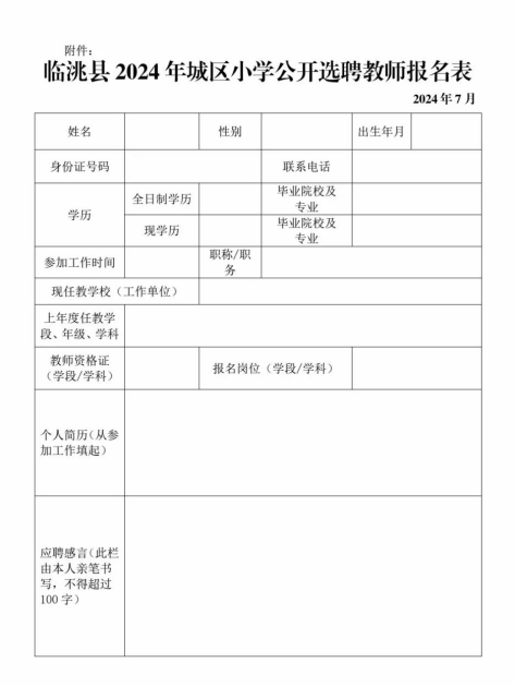附件:臨洮縣2024年城區(qū)小學(xué)公開選聘教師報名表