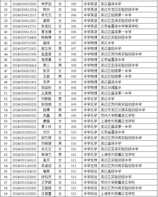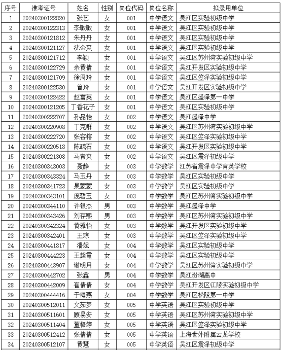 根據(jù)《2024年蘇州市吳江區(qū)教育系統(tǒng)第二次公開(kāi)招聘事業(yè)編制教師公告》,經(jīng)過(guò)考試、體檢、考核(政審)等程序,以下擬聘用人員予以公示。