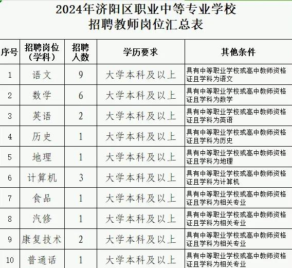 2.招聘崗位、招聘計劃、學(xué)歷要求、教師資格要求等其他條件,見附件《2024年濟(jì)陽區(qū)職業(yè)中等專業(yè)學(xué)校招聘教師崗位匯總表》。
