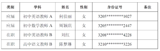 根據(jù)《2024年蘇州高新區(qū)教育系統(tǒng)公開招聘事業(yè)編制教師公告》要求,經(jīng)過報(bào)名、考試、體檢和政審,擬錄用何佳麗等同志,現(xiàn)公示如下: