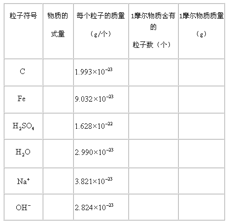 。垡裕菁热晃镔|(zhì)的量是聯(lián)系微觀粒子和宏觀物質(zhì)的橋梁,那么如何通過物質(zhì)的量求出物質(zhì)的質(zhì)量呢?也就是說1mol物質(zhì)的質(zhì)量到底有多大呢?我們先填寫下面的表格,看是否可以從這些數(shù)據(jù)中得出有用的結(jié)論。