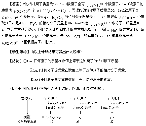 [得出結(jié)論]1 mol任何原子的質(zhì)量,若以克為單位,在數(shù)值上等于其相對(duì)原子質(zhì)量。那么由原子構(gòu)成的分子,1mol分子的質(zhì)量應(yīng)該在數(shù)值上等于其相對(duì)分子質(zhì)量。而對(duì)于離子,由于電子的質(zhì)量很小,可以忽略不計(jì)。因此1mol任何離子的質(zhì)量在數(shù)值上等于這種離子的式量。)