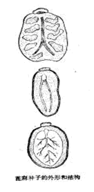 用手捏一捏蓖麻種子的外殼,它很堅(jiān)硬,光澤而有花紋,這是種皮。種皮的闊面中央有一條縱線叫做種脊(圖示)。種脊底部有淺色的海狀突起,叫做種阜。它是種子在果實(shí)上著生的部位。