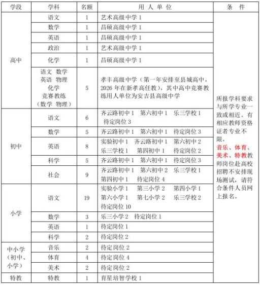 政治素質(zhì)好,遵紀(jì)守法,品行端正,身體健康。有志于長期在安吉從事教育教學(xué)工作,有較強(qiáng)的敬業(yè)精神和團(tuán)結(jié)協(xié)作能力,本科和碩士研究生年齡在30周歲以下(1993年10月23日以后出生),博士研究生和高中招聘第4條第5條、中小學(xué)招聘第5條的年齡在35周歲以下(1988年10月23日以后出生),具有中華人民共和國國籍,且符合下列條件之一的人員均可報(bào)名。