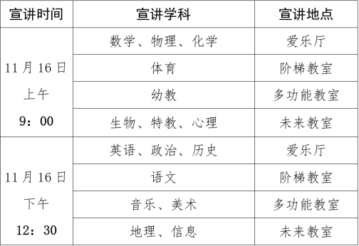 (1)11月16日:分上、下午場次完成各學(xué)科的宣講、資格審核、筆試,具體安排如下。