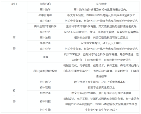[崗位2]:上海中學(xué)國際部全英文教學(xué)的學(xué)科教師,涵蓋小學(xué)1年級到高中12年級部門學(xué)科名稱崗位要求