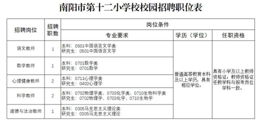 5.具備招聘崗位要求的其他條件(詳見《南陽市第十二小學校校園招聘職位表》)。