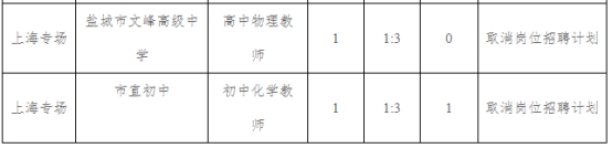 根據(jù)2024年11月12日發(fā)布的《江蘇省鹽城市教育局直屬學(xué)校2024年下半年校園公開招聘具有碩士研究生及以上學(xué)歷學(xué)位優(yōu)秀青年人才公告》,目前報(bào)名、資格初審已完成,上海專場(chǎng)因部分職位報(bào)名成功人數(shù)未達(dá)開考比例,現(xiàn)擬降低部分緊缺學(xué)科崗位開考比例至1:2,核減(取消)部分崗位招聘計(jì)劃,具體情況如下: