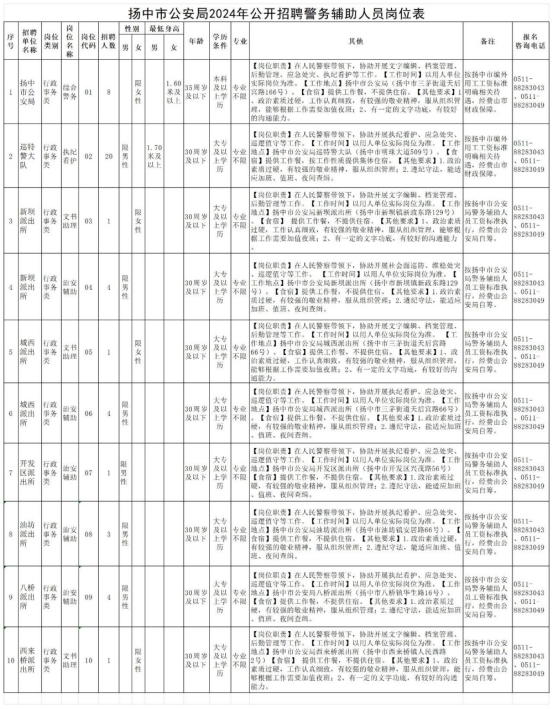 根據(jù)工作需要,揚(yáng)中市公安局現(xiàn)面向社會(huì)公開招聘警務(wù)輔助人員47名(警務(wù)輔助人員是指根據(jù)社會(huì)治安形勢和公安工作實(shí)際需要,面向社會(huì)公開招聘,為公安機(jī)關(guān)警務(wù)活動(dòng)提供輔助支持的非人民警察身份人員),現(xiàn)將有關(guān)事項(xiàng)公告如下:具體崗位表信息(點(diǎn)擊圖片可放大查看)