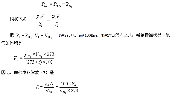 原理 用已知質(zhì)量的鎂條跟過量的酸反應(yīng)產(chǎn)生氫氣。把這氫氣的體積、實(shí)驗(yàn)時(shí)的溫度和壓強(qiáng)代入理想氣體狀態(tài)方程(PV=nRT)中,就能算出摩爾氣體常數(shù)R的值。氫氣中混有水蒸氣,根據(jù)分壓定律可求得氫氣的分壓(p(H2)=p(總)-p(H2O)),不同溫度下的p(H2O)值可以查表得到。