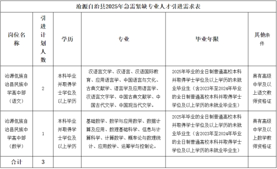 為進(jìn)一步加強(qiáng)我縣高中教師隊伍建設(shè),優(yōu)化教師隊伍結(jié)構(gòu),促進(jìn)學(xué)?沙掷m(xù)發(fā)展,滄源自治縣民族中學(xué)高中部擬引進(jìn)急需緊缺專業(yè)人才3名,現(xiàn)將有關(guān)事項公告如下:
