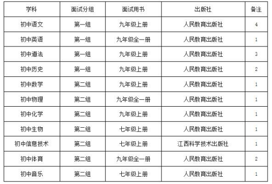 (3)面試總分100分。每人面試時間15分鐘。面試采用試講方式,分兩組進行,采用廣豐區(qū)現(xiàn)行初中教材。