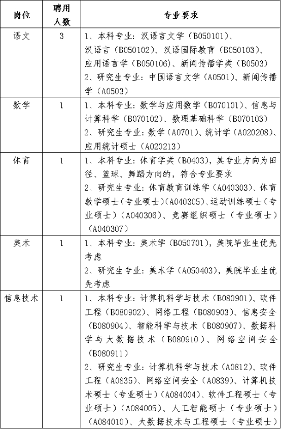 3.畢業(yè)生須持有符合要求的教師資格證,專業(yè)對口,任教科目與招聘科目一致,具體詳見下表: