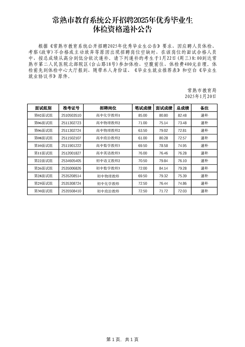 2025年蘇州市常熟市教育系統(tǒng)公開(kāi)招聘優(yōu)秀畢業(yè)生體檢資格遞補(bǔ)公告