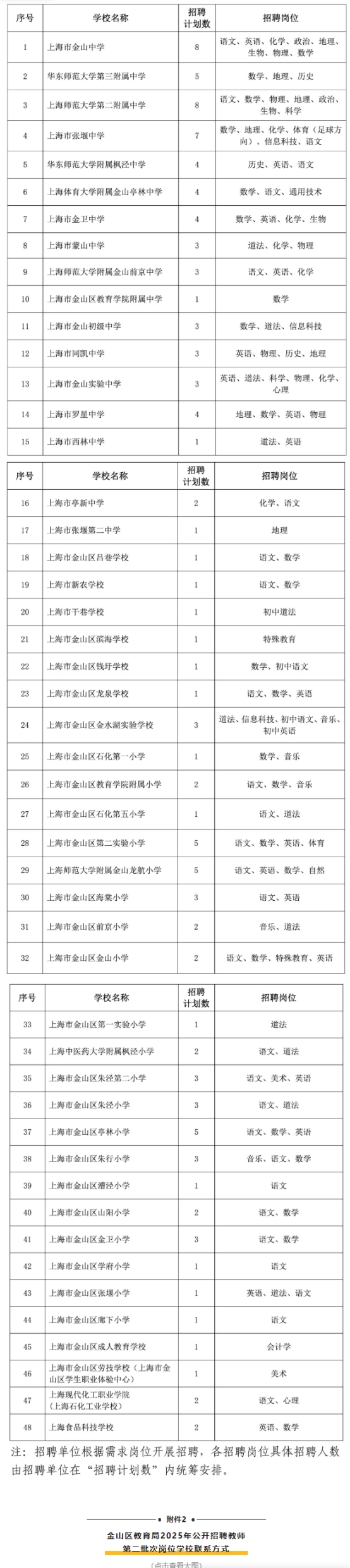 附件1:金山區(qū)教育局2025年公開(kāi)招聘教師第二批次崗位明細(xì)