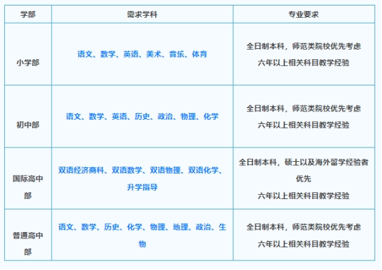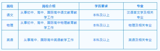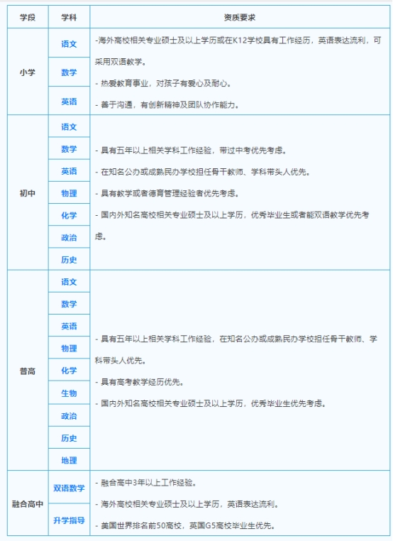 2.具有相關(guān)學(xué)科3年及以上教學(xué)經(jīng)驗(yàn),具有優(yōu)秀教學(xué)成果或公辦/民辦學(xué)校教學(xué)經(jīng)驗(yàn)者優(yōu)先;有Alevel/IB國(guó)際教育經(jīng)驗(yàn)或海外留學(xué)經(jīng)歷優(yōu)先。