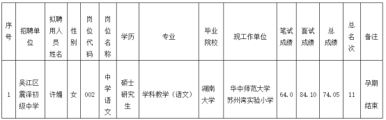 根據(jù)《2024年蘇州市吳江區(qū)教育系統(tǒng)第二次公開招聘事業(yè)編制教師公告》,經(jīng)過(guò)考試、體檢、考核(政審)等程序,以下擬聘用人員予以公示。