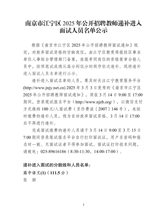 2025年南京市江寧區(qū)公開招聘教師遞補(bǔ)進(jìn)入面試人員名單公示