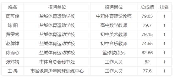 鹽城市體育局直屬事業(yè)單位2024年公開(kāi)招聘工作人員筆試、面試工作已順利結(jié)束,現(xiàn)將進(jìn)入體檢、考察人員名單公布如下: