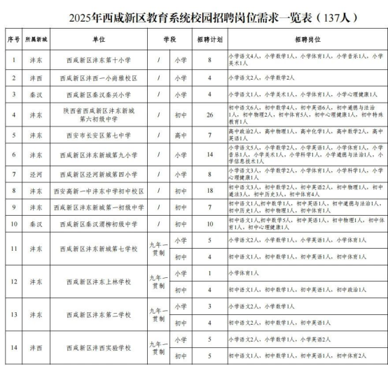 計(jì)劃為西咸新區(qū)14所公辦中小學(xué)校招聘教師137人,具體崗位及人數(shù)見《2025年西咸新區(qū)教育系統(tǒng)校園招聘崗位需求一覽表》。