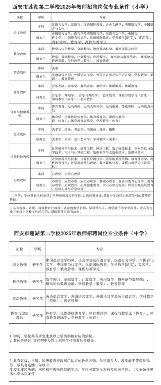 3.應(yīng)聘初中教師應(yīng)具備研究生及以上學(xué)歷和相應(yīng)學(xué)位,應(yīng)聘小學(xué)教師應(yīng)具備大學(xué)本科及以上學(xué)歷和相應(yīng)學(xué)位。(詳見西安市蓮湖第二學(xué)校2025年教師招聘崗位條件(小學(xué))/(中學(xué)))