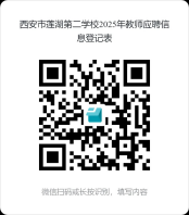 應(yīng)聘人員掃描二維碼在線填寫《西安市蓮湖第二學(xué)校2025年教師應(yīng)聘信息登記表》,并將個(gè)人簡(jiǎn)歷電子稿發(fā)送至郵箱xaslhdexx@126.com或送至西安市蓮湖第二學(xué)校傳達(dá)室。報(bào)名日期:即日起至2025年4月22日。