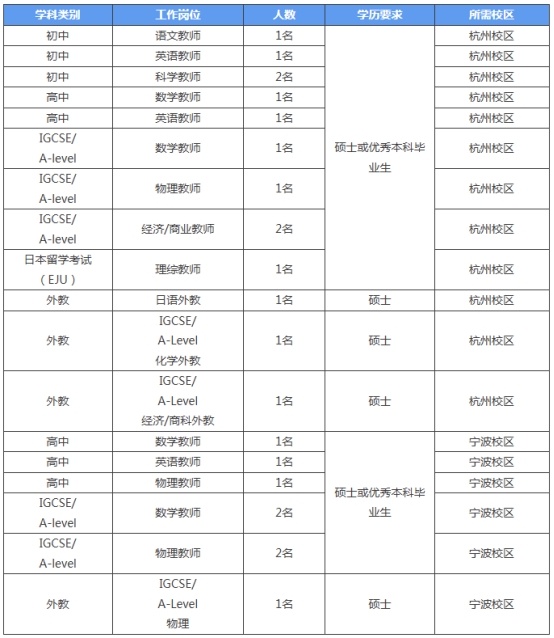 崗位:初中語文教師、初中英語教師、初中科學(xué)教師、高中數(shù)學(xué)教師、高中英語教師、高中物理教師