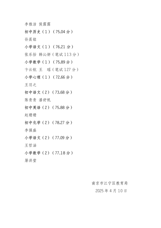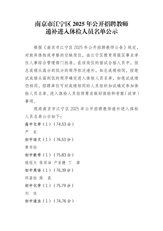 2025年南京市江寧區(qū)公開招聘教師遞補(bǔ)進(jìn)入體檢人員名單公示