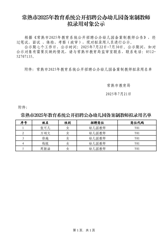 2025年蘇州常熟市教育系統(tǒng)公開(kāi)招聘公辦幼兒園備案制教師擬錄用對(duì)象公示