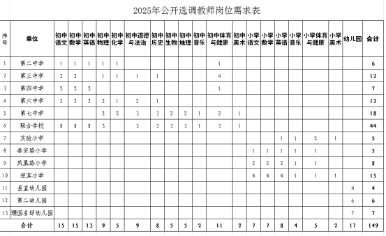 為全面加強(qiáng)教師隊(duì)伍建設(shè),根據(jù)我縣教育事業(yè)發(fā)展需要,經(jīng)局黨組研究,決定為城區(qū)部分學(xué)校公開選調(diào)教師149名,F(xiàn)公告如下: