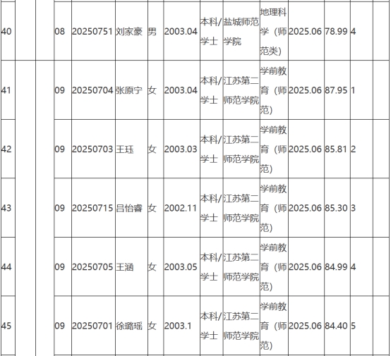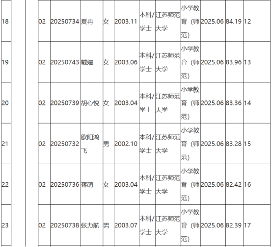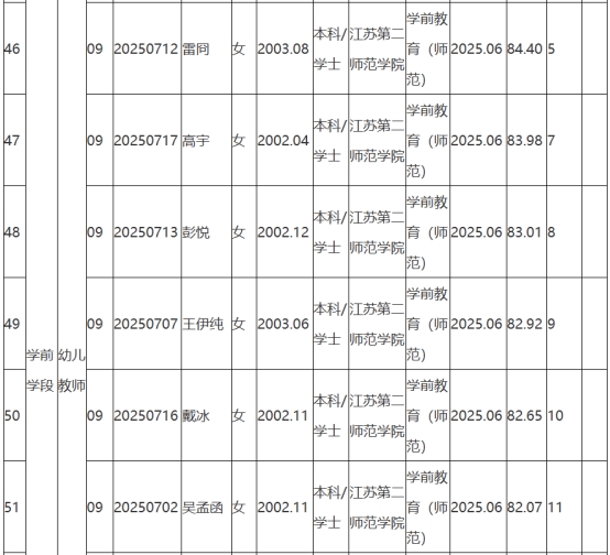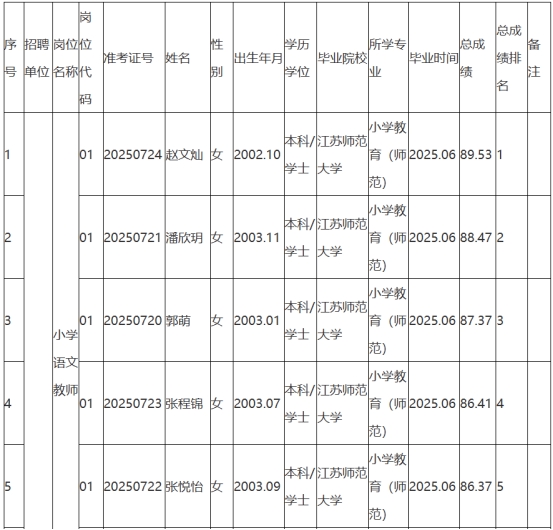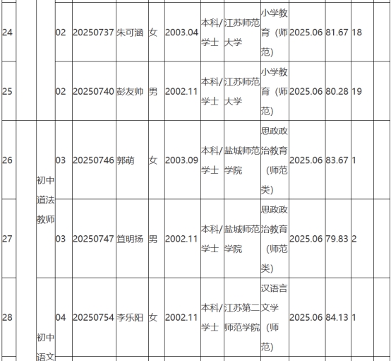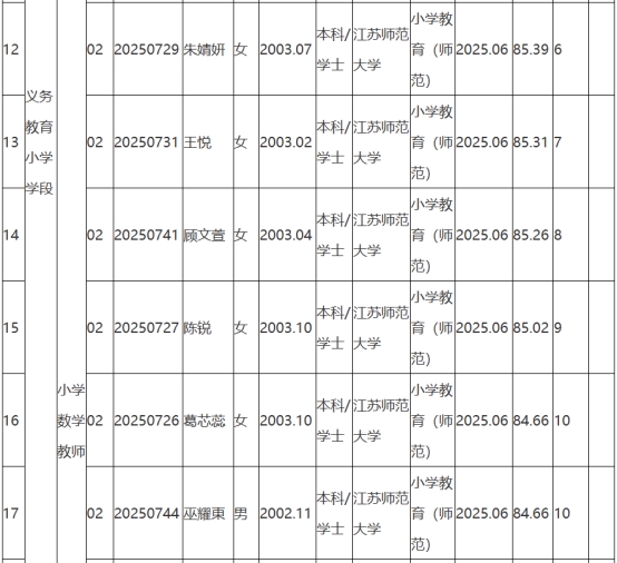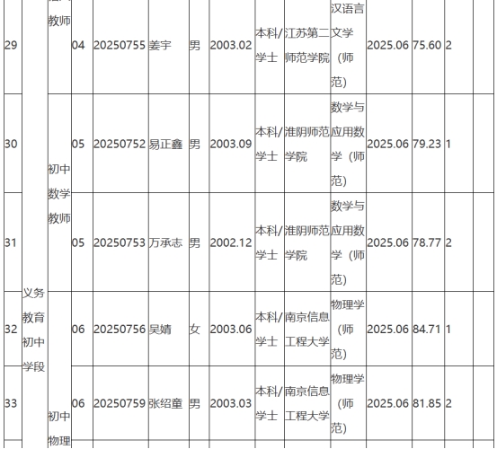 根據(jù)《2025年句容市教育局面向鄉(xiāng)村定向師范生公開招聘教師公告》(鎮(zhèn)句事招公告〔2025〕6號)經(jīng)資格審查、學(xué)業(yè)水平測試、體檢和考察,現(xiàn)將2025年句容市教育局面向鄉(xiāng)村定向師范生公開招聘教師擬聘用人員名單予以公示,公示時(shí)間2025年8月25日-9月2日。