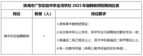 為深入貫徹落實“百萬英才匯南粵”動計劃,加強教師隊伍建設(shè),著力推進珠海市教育高質(zhì)量發(fā)展,根據(jù)2025年我校人力資源配備的需求實際,現(xiàn)向社會公開招聘臨聘教師,2025年9月中下旬上崗。具體招聘事項通告如下: