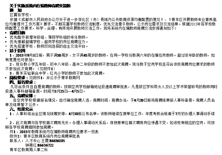 近期,青羊區(qū)教育局頒發(fā)了《關(guān)于實(shí)施系統(tǒng)內(nèi)在編教師競(jìng)聘交流的通知》(附后),也就拉開了區(qū)域內(nèi)教師崗位流動(dòng)工作的序幕。同時(shí),由于我校工作需要,將考核初中語(yǔ)文、數(shù)學(xué)、英語(yǔ)、物理、化學(xué)、政治、生物、地理學(xué)科教師數(shù)名(已上報(bào)教育局公示,并附后)。歡迎區(qū)內(nèi)符合條件的學(xué)科老師報(bào)名競(jìng)聘,我們將查看簡(jiǎn)歷后及時(shí)聯(lián)系。