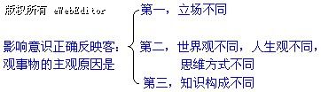 這一點(diǎn)教材主要從主觀方面分析了其原因。主要從:立場不同;世界觀不同,人生觀不同,思維方法不同;知識構(gòu)成不同。這三個(gè)方面進(jìn)行了分析。人們由于站在不同的階級利益立場上,因而必然會維護(hù)自己的階級利益,階級利益的不同導(dǎo)致在看問題的時(shí)候形成不同的看法。世界觀和人生觀不同,導(dǎo)致人們在思考問題的時(shí)候會形成不同的思維方法,因而影響人們的認(rèn)識。知識構(gòu)成不同使不同知識層次的人對待同一事物有著不同的認(rèn)識。