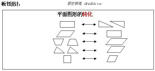 教學(xué)重點(diǎn):使學(xué)生利用學(xué)具發(fā)現(xiàn)長方形、正方形、平行四邊形、三角形、梯形能相互轉(zhuǎn)化。