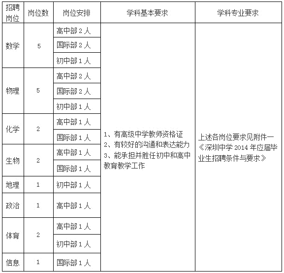 具體要求見附件2《深圳科學高中2014年應屆畢業(yè)生招聘計劃表》