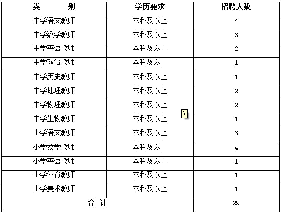 目前,學(xué)校已招收初中一年級、小學(xué)一年級各6個(gè)班,共12個(gè)班。為保障2014年的教學(xué)計(jì)劃,決定面向全國公開招聘29名合同制中學(xué)、小學(xué)各學(xué)科教師,F(xiàn)將招聘事項(xiàng)公告如下: