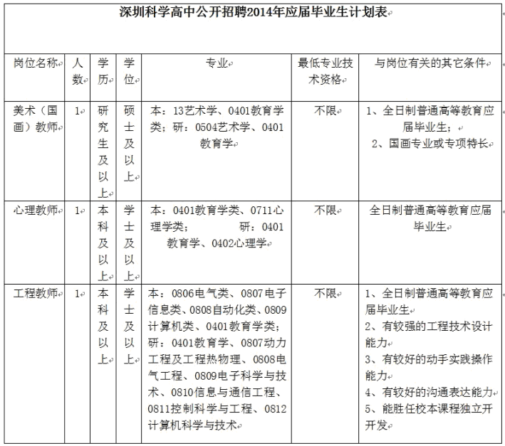深圳科學(xué)高中面向2014屆應(yīng)屆畢業(yè)生招聘美術(shù)、心理、通用技術(shù)教師公告